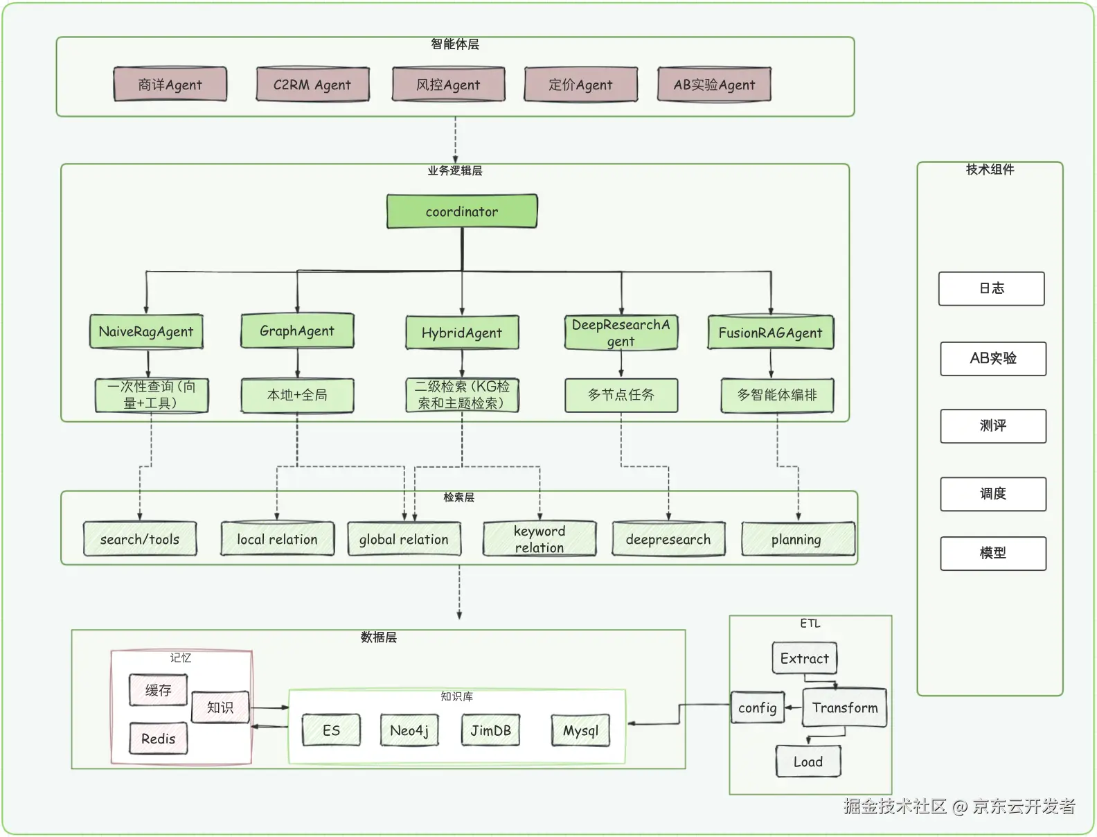 工程架构分了四层:智能体层,业务逻辑层,检索层,数据层;技术栈:Spring AI ,Elasticsearch8+,Neo4j,Redis,京东云;技术能力支持上支持Python Code和RAG Agent Workflow。