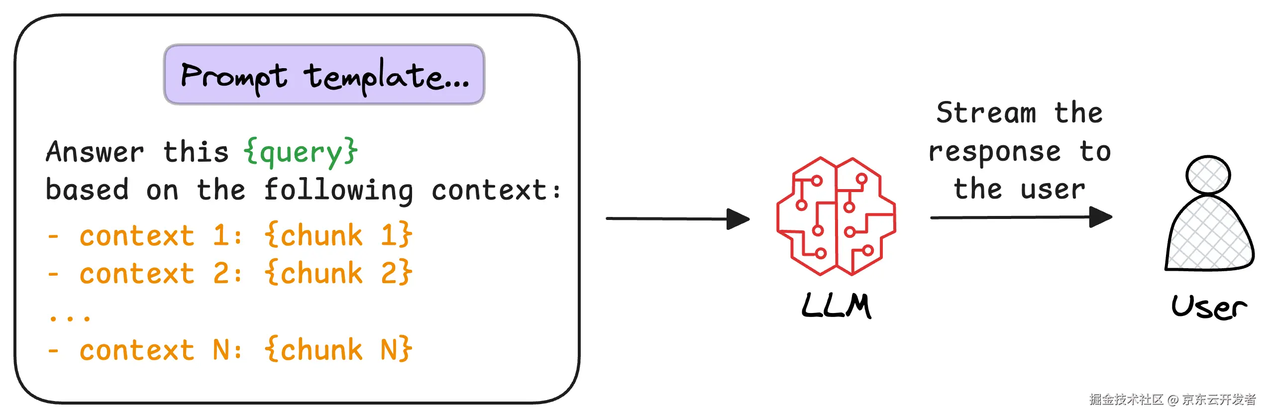 最后一步是生成结果,将原始的查询和检索到的文本块,拼接到Prompt中,由大模型生成最终的结果。