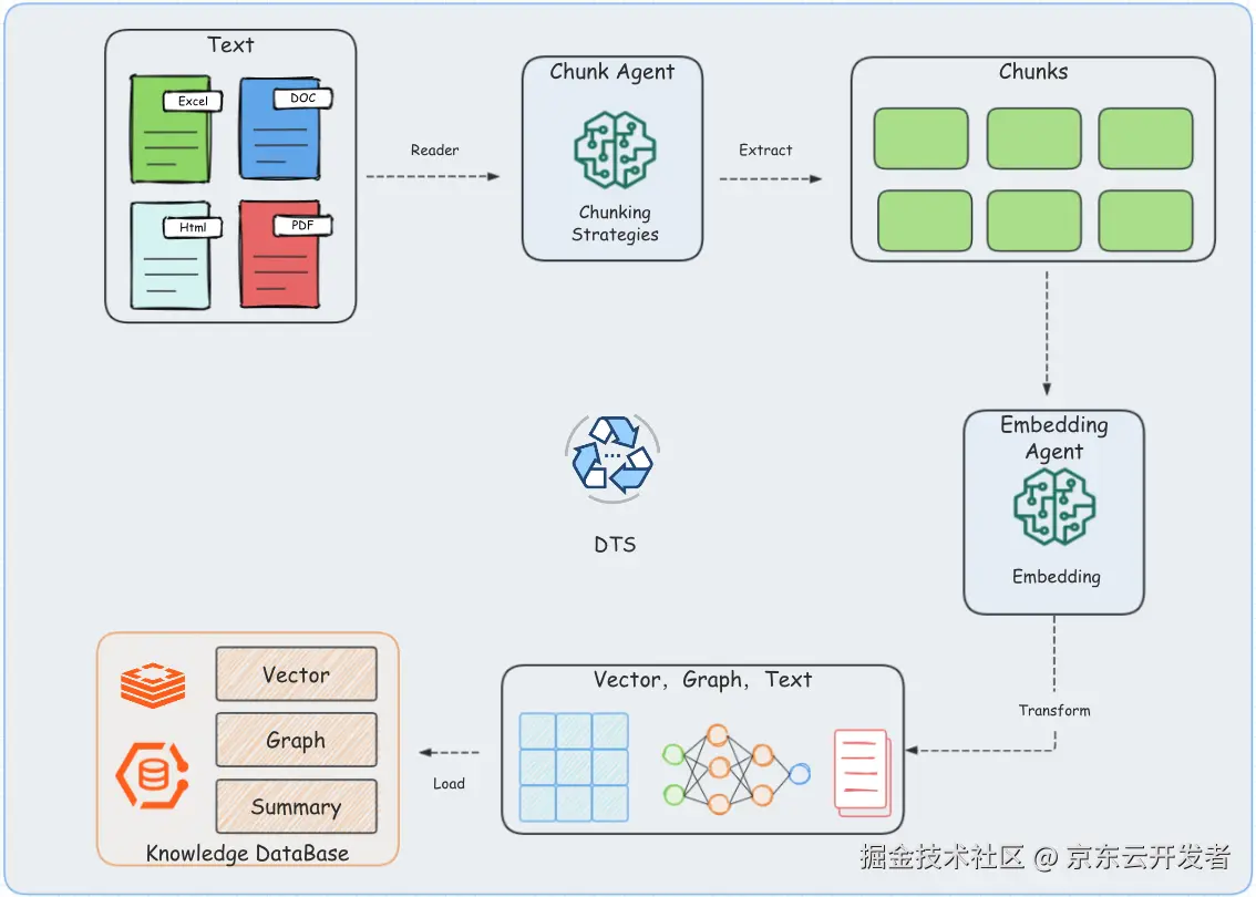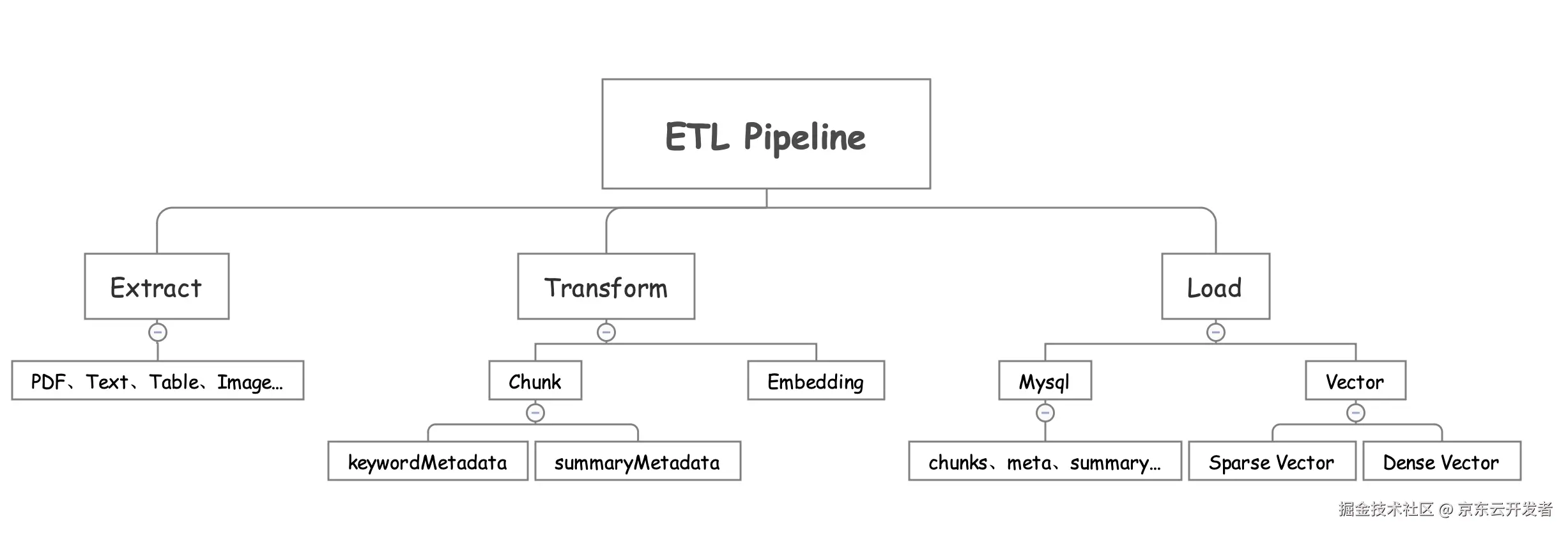 数据加载(Load) : 数据存储,我们用的Elasticsearch8+(ES)进行混合存储,当然也可以其他向量库和关系型数据库来存储。