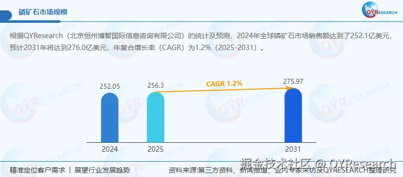 根据QYResearch的统计及预测,2024年全球磷矿石市场销售额达到了252.1亿美元,预计2031年将达到276.0亿美元,年复合增长率(CAGR)为1.2%(2025-2031)。地区层面来看,中国市场在过去几年变化较快,2024年市场规模为 百万美元,约占全球的 %,预计2031年将达到 百万美元,届时全球占比将达到 %。