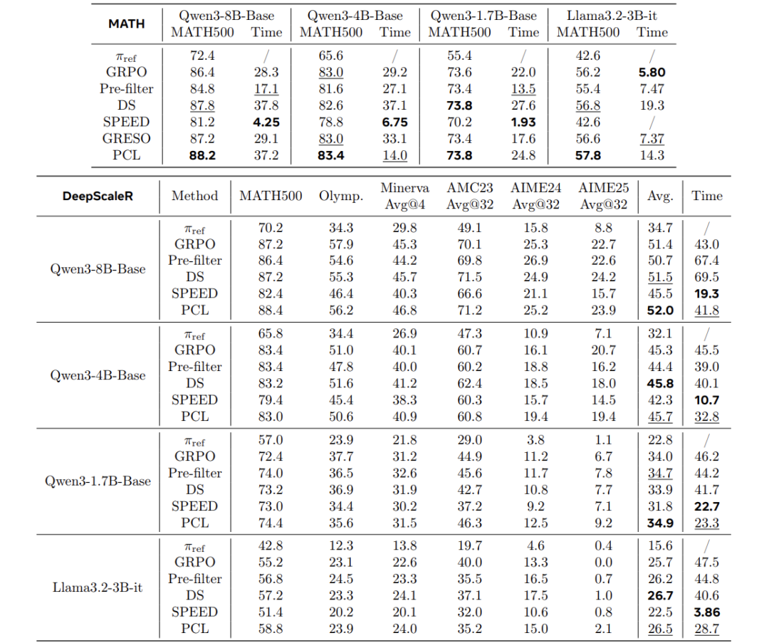 论文在多个模型(Qwen3-1.7B/4B/8B-base, Llama3.2-3B-it)和数据集(MATH、DeepScaleR等)上验证PCL,并与五种基线方法对比: