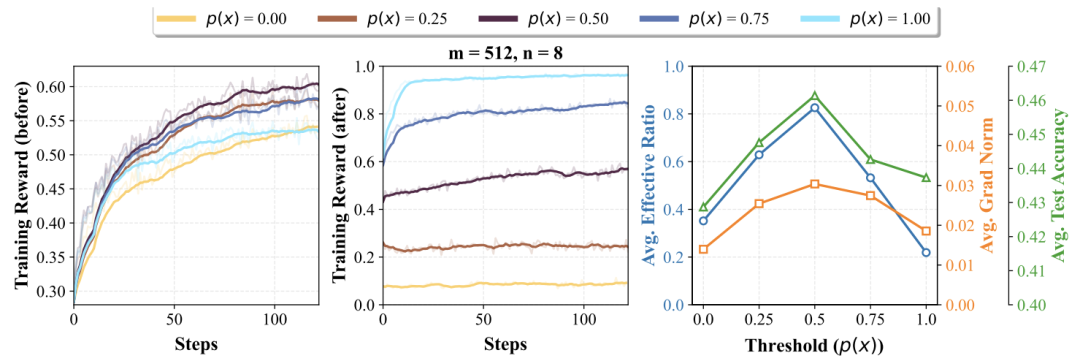 相比之下,过于简单或困难的提示会导致梯度信号微弱,浪费计算资源。