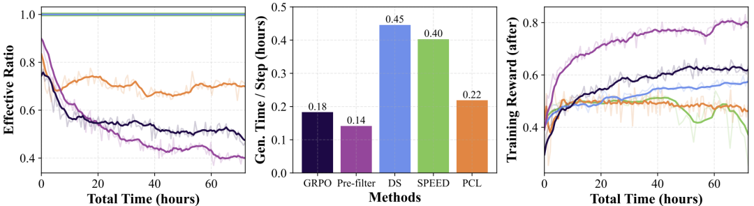 图6显示PCL的有效比率始终高于GRPO和Pre-filter,而生成时间低于DS和SPEED。