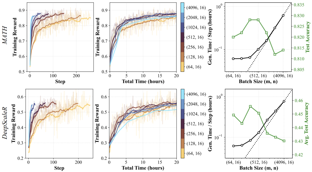 不同批量配置下训练奖励随步骤与时间的变化,以及生成时间与测试准确率的关系