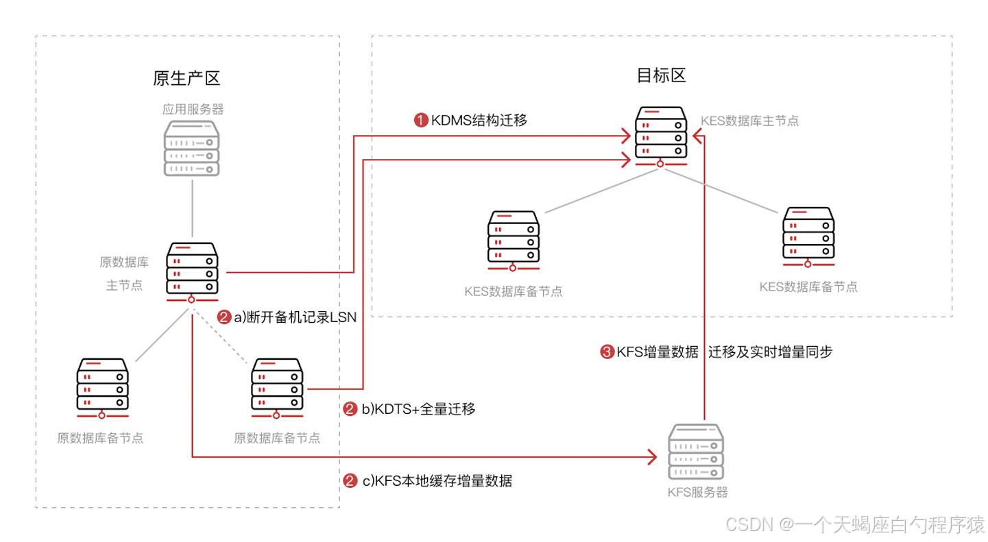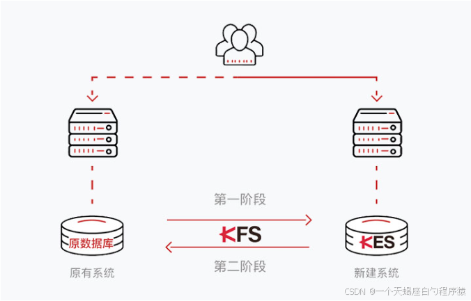 不改变原有拓扑,KES 为主系统,原端为备系统,通过 KFS 实现 KES 与原库的反向同步,两端数据一致,国产环境若发生故障,原系统可迅速接管。