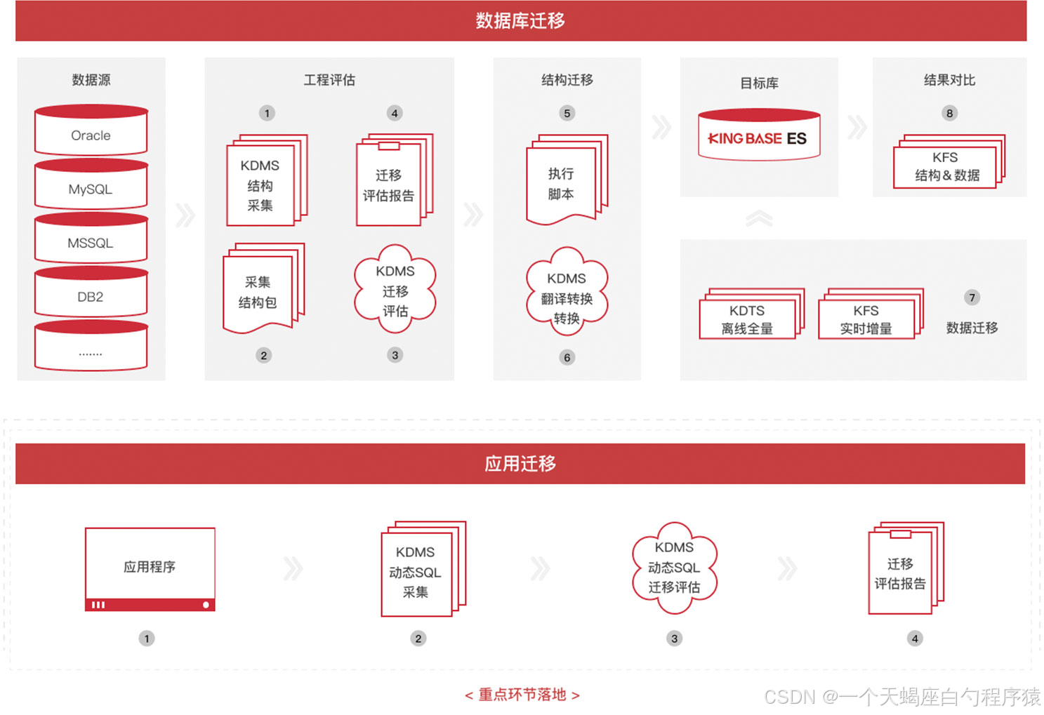 将数据库迁移过程划分为工程评估、结构迁移、数据迁移及结果比对四个阶段,提供数据迁移评估系统(KDMS)、数据迁移工具(KDTS)、异构数据同步及结果验证工具(KFS)以保证环节自动化落地。
