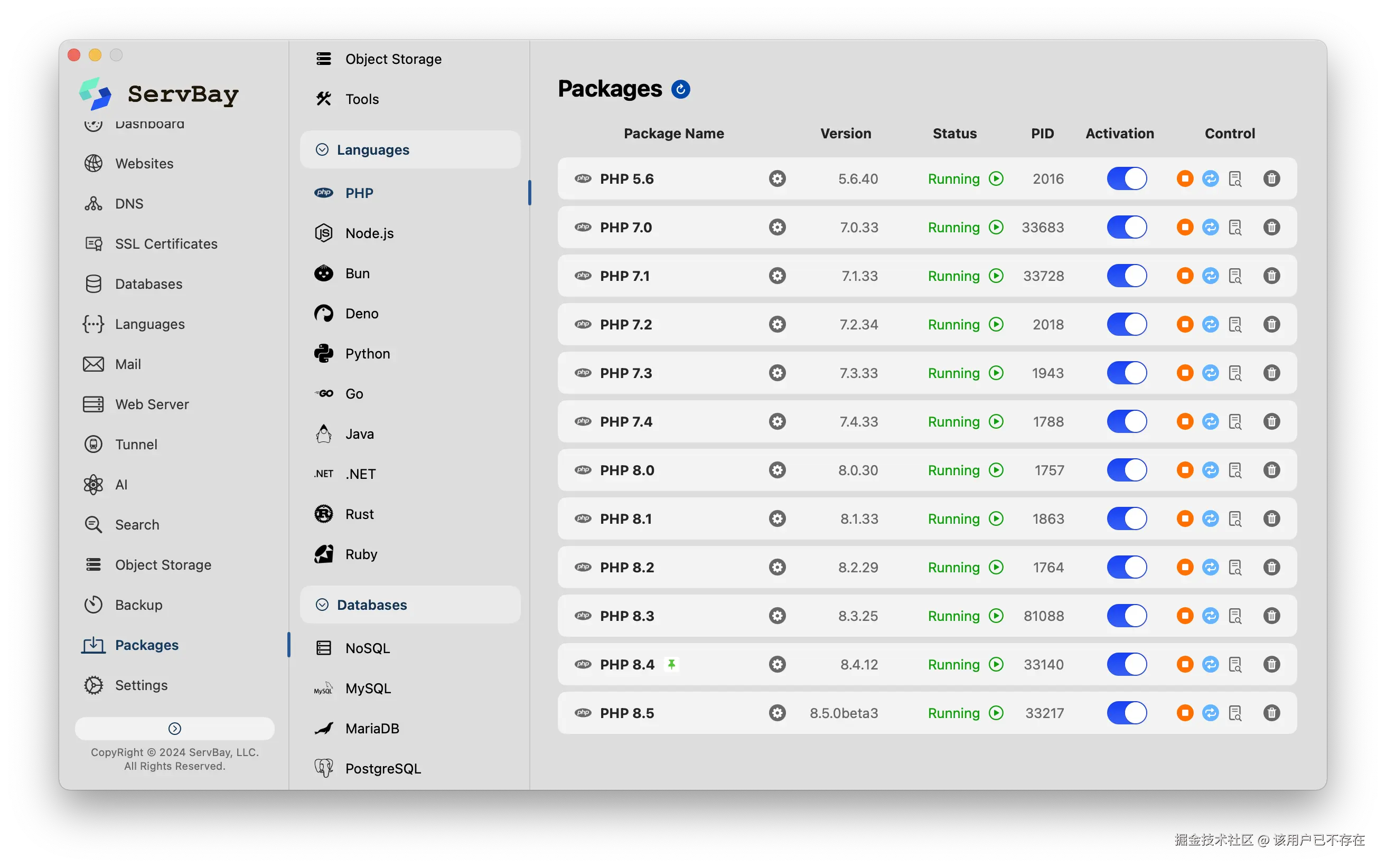 - 广泛的多版本支持: ServBay 内置了多种主流语言的多个版本,无论是老古董的 PHP、Node.js、Python 项目,还是基于 Go、Rust、Java 的服务,都能轻松创建对应的运行环境。