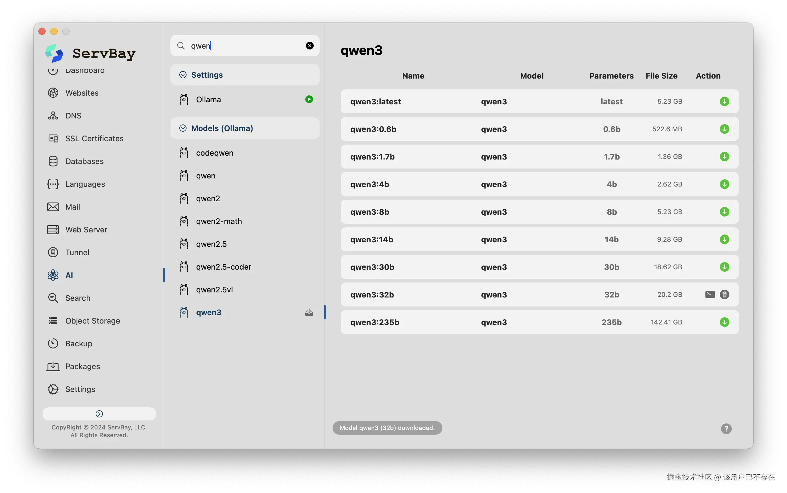 在 ServBay 提供的纯净隔离环境中,我就可以毫无顾忌地运行这些测试,验证代码在特定环境下的行为,为后续的重构打下坚实的基础。此外,ServBay 还支持一键部署本地 AI功能,这样还能帮我分析那些代码,不然光是阅读那大几十万行代码,三体人来了我都不一定能看得完。