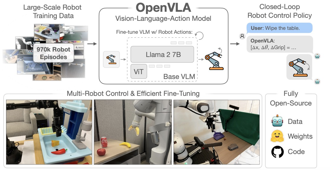 OpenVLA的最大特色是真正的开源,包括权重、数据和代码,而之前的VLA系统都是封闭的。它还提供了用于训练VLA模型的模块化PyTorch代码库,支持从单GPU微调到多节点GPU集群训练。