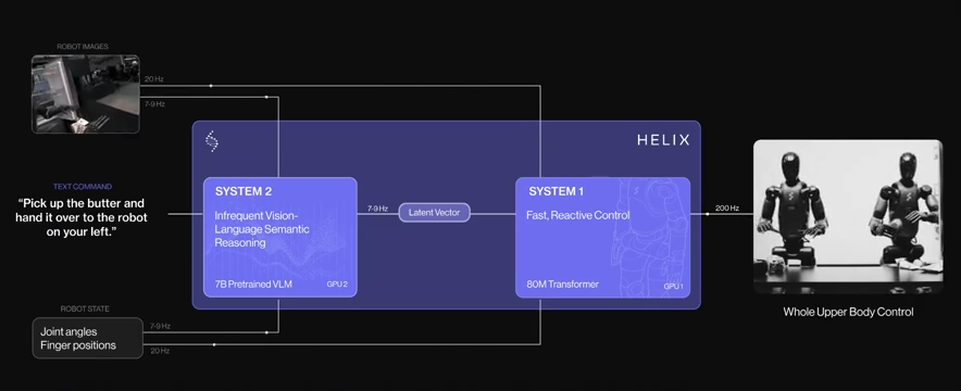 Helix是Figure.AI于2025年2月发布的VLA模型,被认为是机器人领域最接近量产的VLA系统。其优势包括: