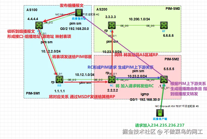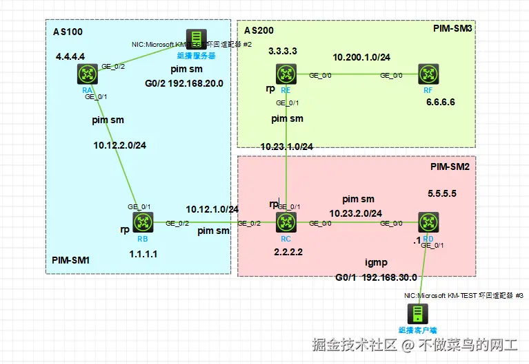 - AS100与AS200要部署域间组播。RB是AS100RP,RC是AS200-PIM-SM2-RP RE是PIM-SM3-RP。要求组播客户端可以通过组播地址234.235.236.237访问组播服务器