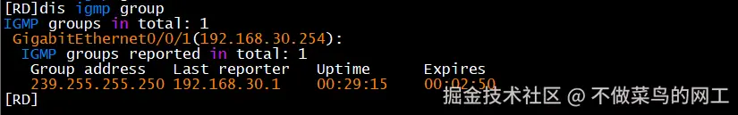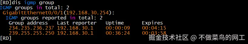 组播客户端上行接口配置igmp 且RD使能igmp功能 用于侦听组播客户端join请求