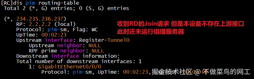 RD正常接受下游主机客户端的Join请求 且上游接口指向PIM-RP(RC路由器)