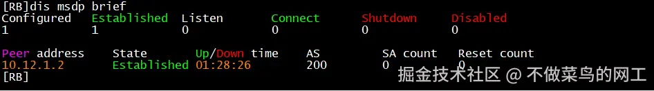 peer 10.12.1.2 connect-interface GigabitEthernet0/0/2 # 建立MSDP邻居