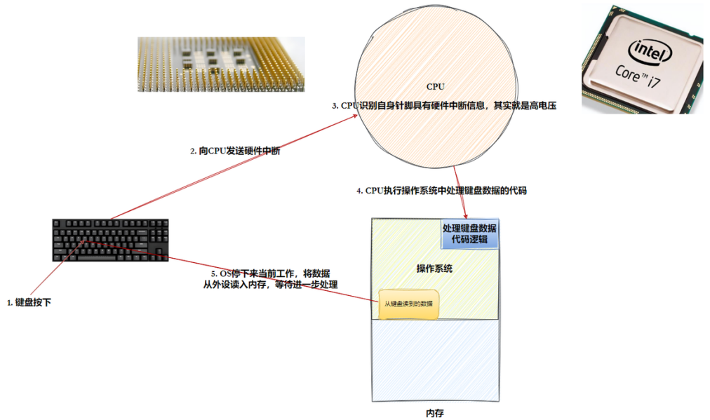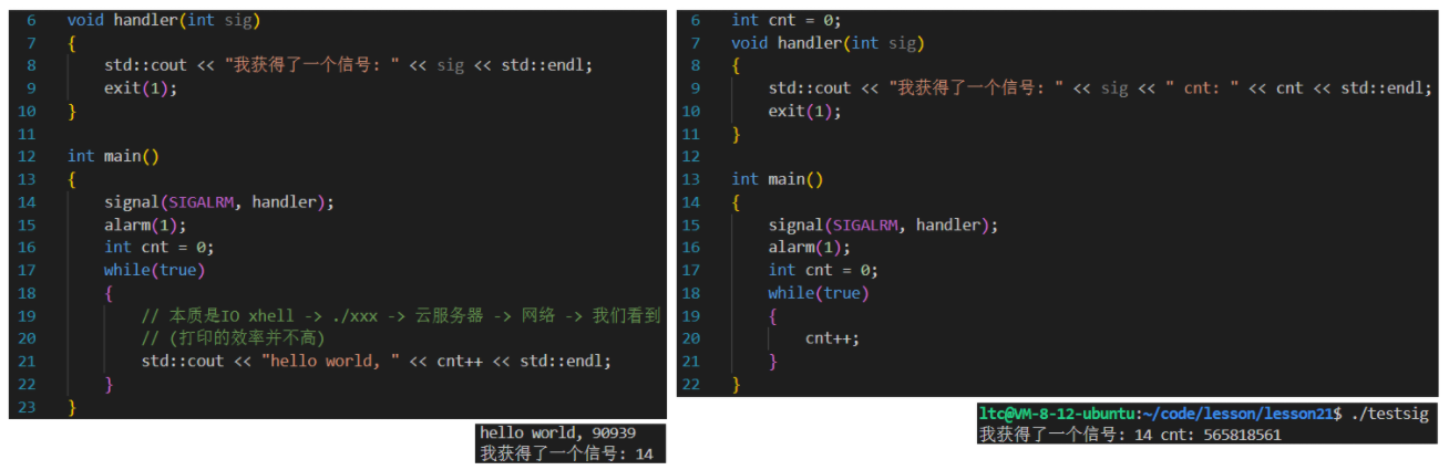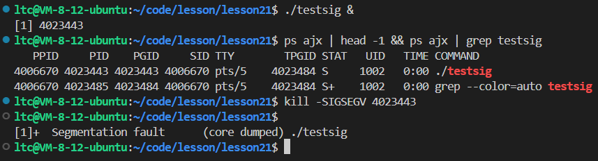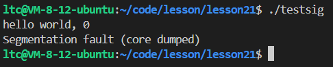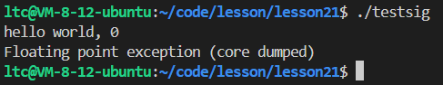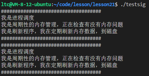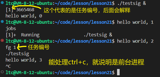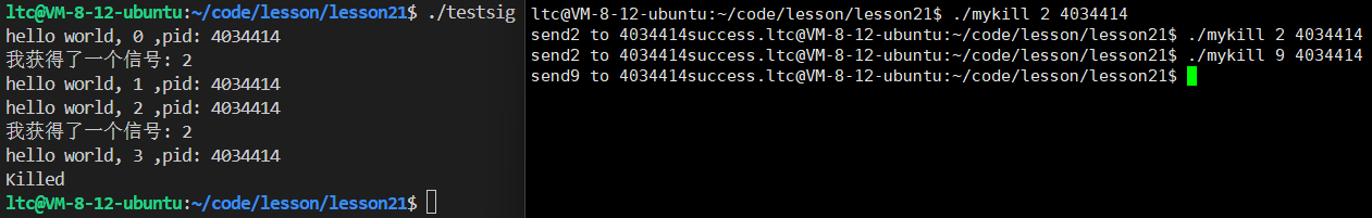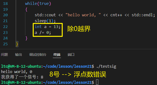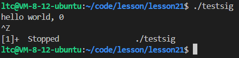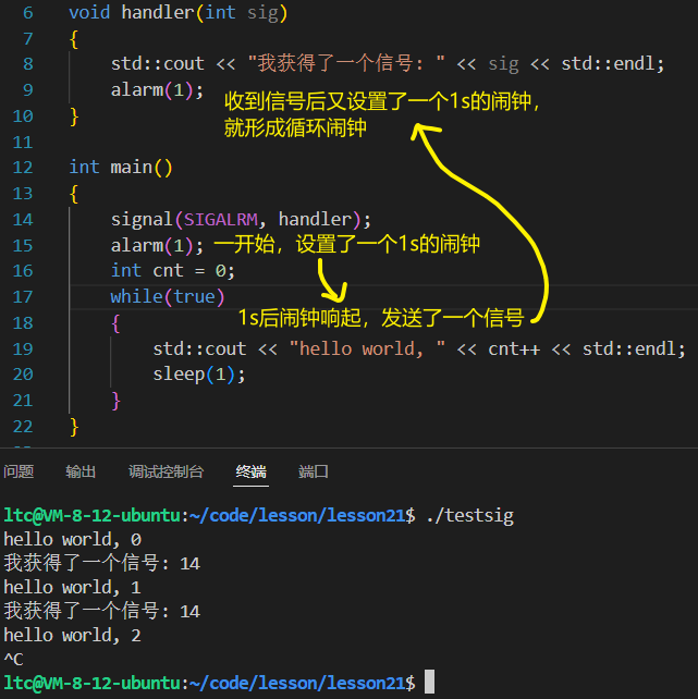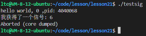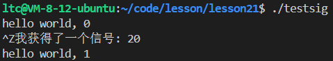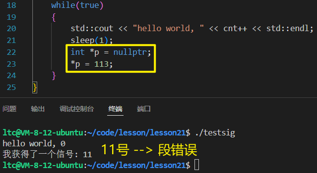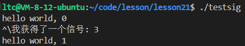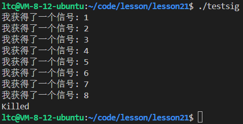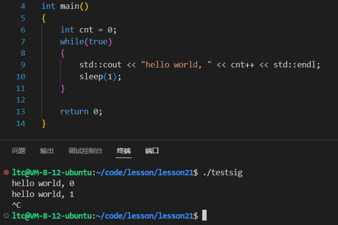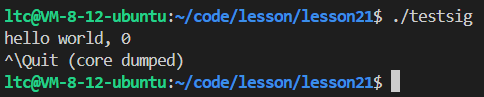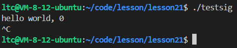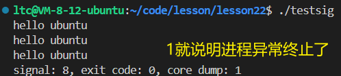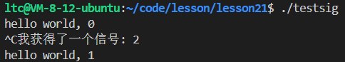 下面这段代码中我启动了一个进程,当我按下Ctrl+c,这个键盘产生一个硬件中断,被OS获取,解释成信号,发送给目标进程,目标进程收到信号,进而引起进程退出