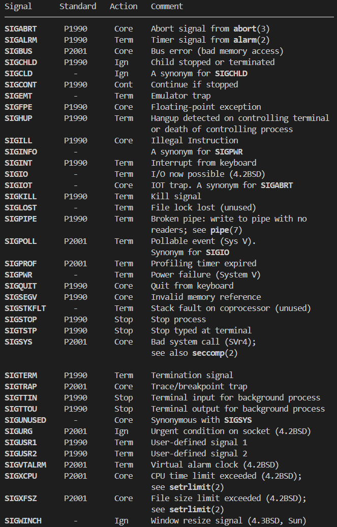 --> 可以查看这些信号各自在什么条件下产生,默认的处理动作是什么