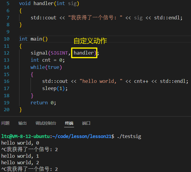 函数设置了捕捉行为处理方式(相对来说,比较多信号的处理动作,就是让自己终止)