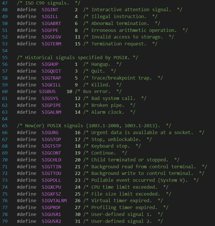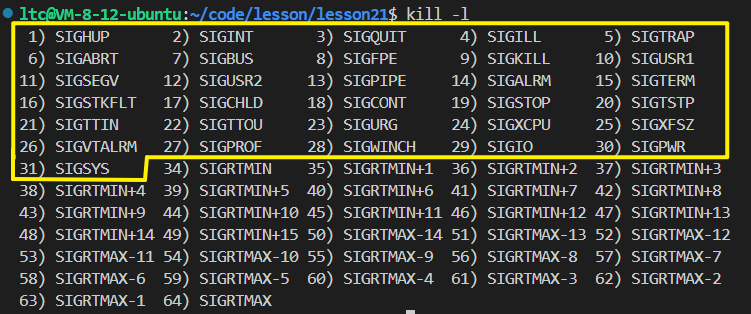 主要关注 1-31 普通信号,而 34-64 实时信号,后续再介绍