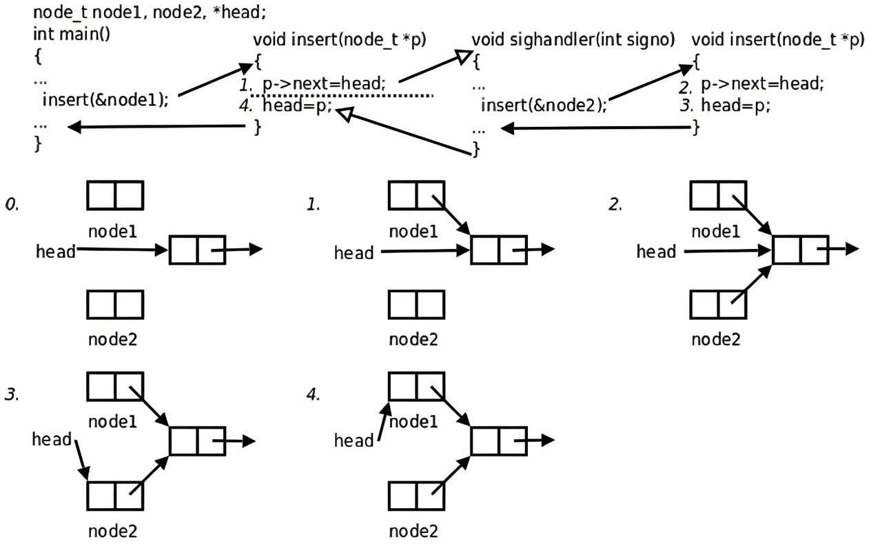 ,插⼊操作分为两步,刚做完第⼀步的时候,因为硬件中断使进程切换到内核,再次回⽤⼾态之前检查到有信号待处理,于是切换到sighandler