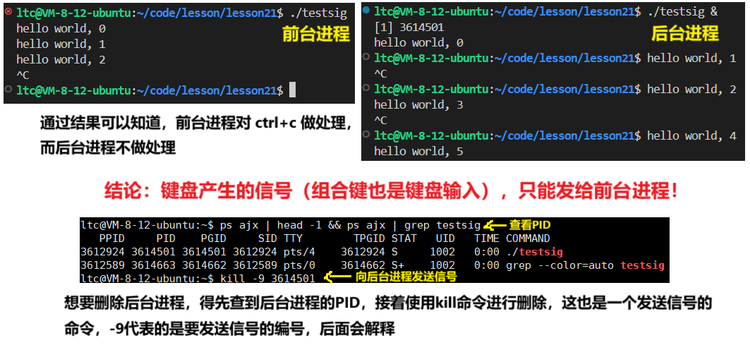 产⽣的信号只能发给前台进程,⼀个命令后⾯加个&可以放到后台运⾏,这样Shell不必等待进程结束就可以接受新的命令,启动新的进程Shell可以同时运⾏⼀个前台进程和任意多个后台进程,只有前台进程才能接到像