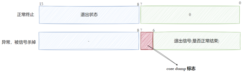 printf("signal: %d, exit code: %d, core dump: %d\n",