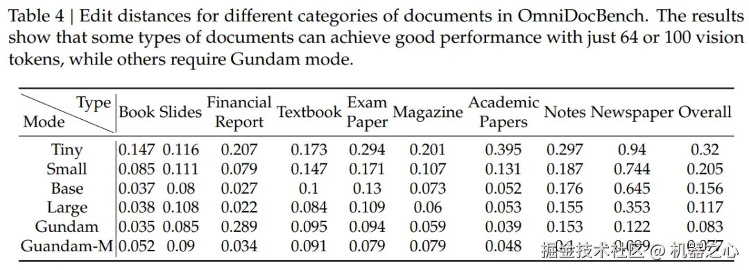 表 4 结果表明,不同类型文档对视觉 token 的需求差异较大: