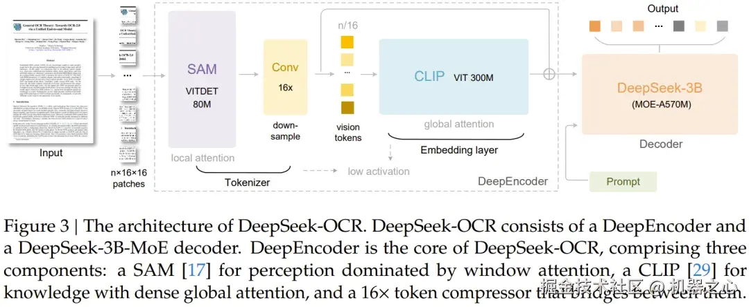 其中,编码器 (即 DeepEncoder) 负责提取图像特征,并将视觉表示进行 Token 化和压缩。解码器则用于根据图像 Token 和提示词 (prompt) 生成所需的结果。