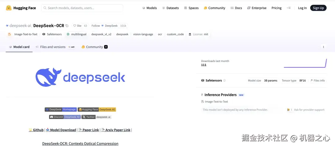 没想到吧,DeepSeek 刚刚开源了新模型,还是一款 OCR 模型。可以看到,该模型的参数量为 3B,刚上线不久就已经有 100 多次下载量了。