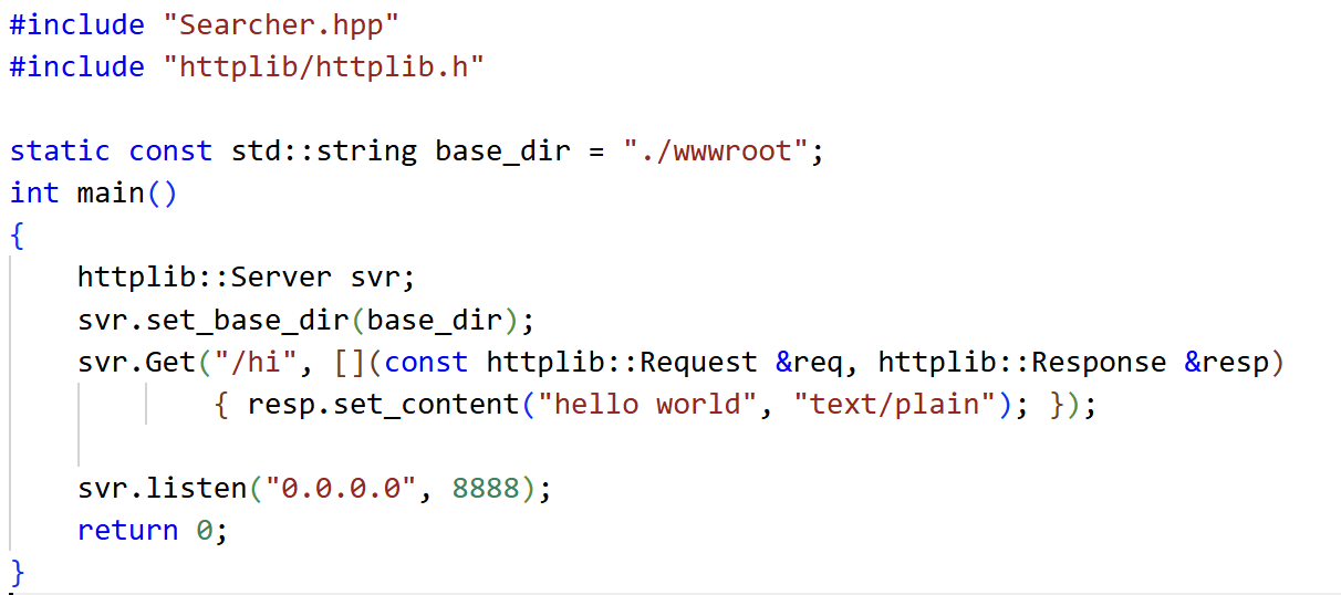 Get:设置http请求方法GET,第一个参数uri为"/hi",第二个参数回调std::function<void(const httplib::Request &, httplib::Response &)>