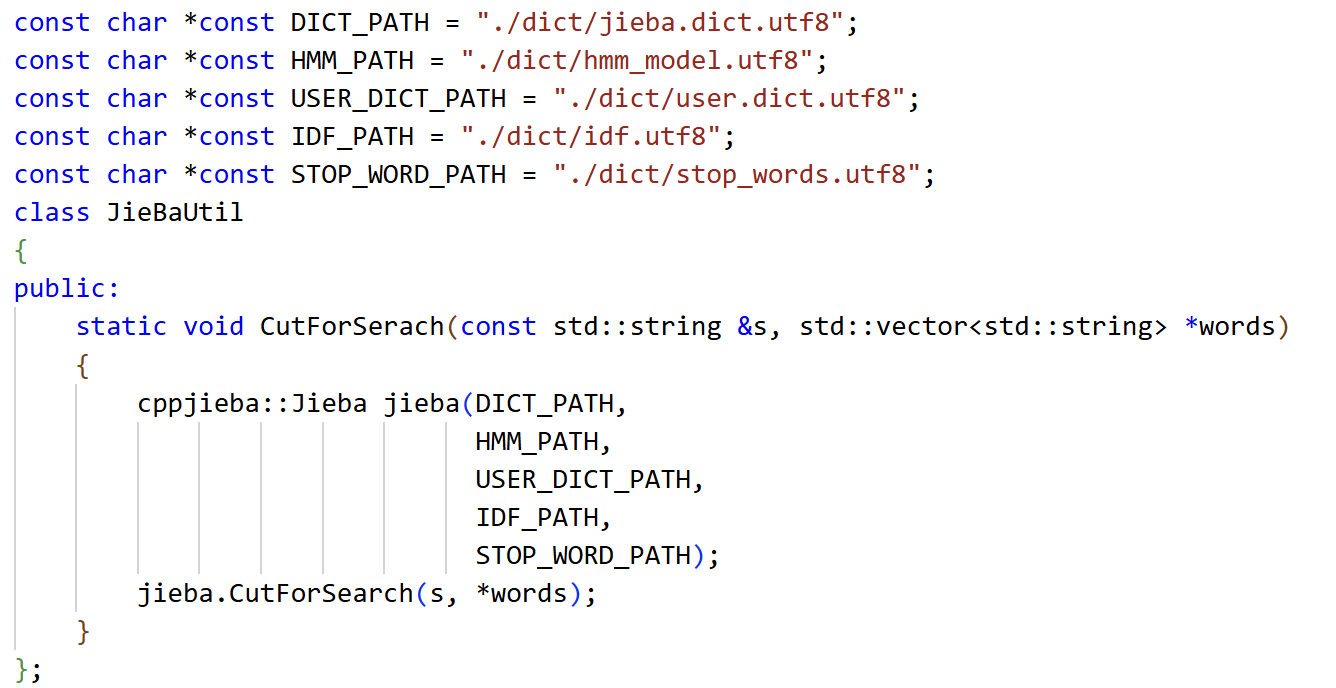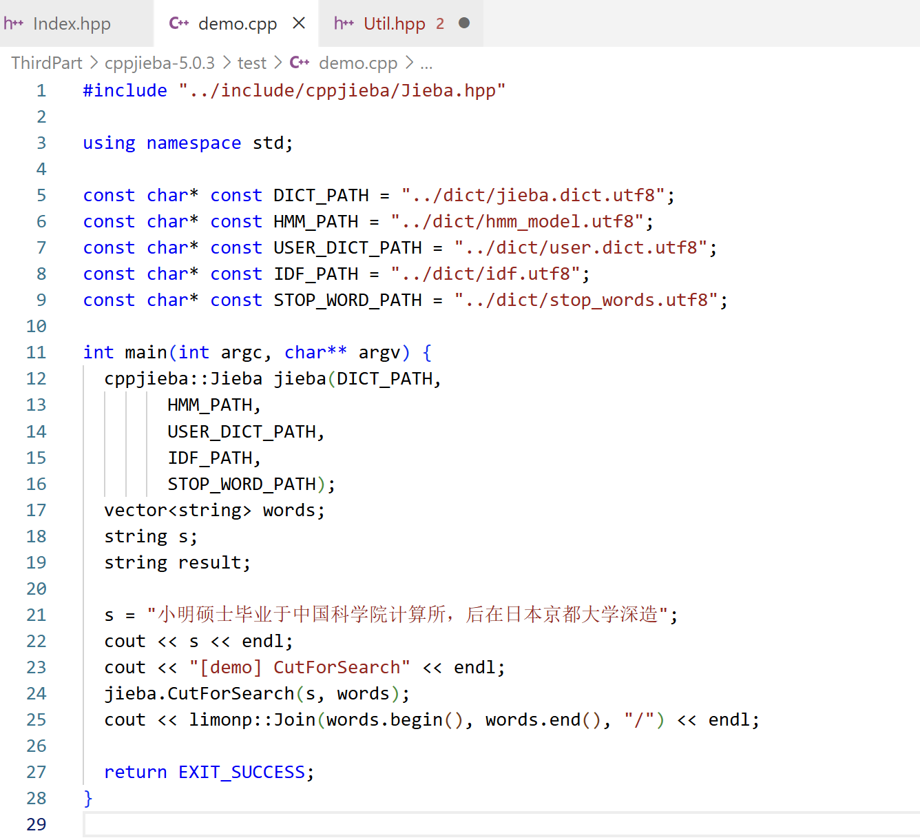 注意事项:将cppjieba-5.0.3/deps/limonp目录拷贝到 cppjieba-5.0.3/include/cppjieba使用jieba.CutForSearch(string, vector<string>)