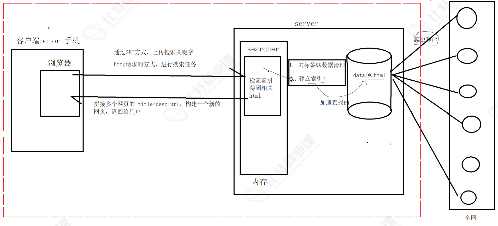 用户通过客户端(例如浏览器,应用程序)上传搜索关键字,客户端以HTTP请求方式进行搜索任务。服务端主机根据关键字通过已经建立好的索引(如果是全网搜索,搜索引擎会定期向全网网站进行爬虫,建立和更新索引;对于站内搜索,则时可以在服务启动前就建立好索引)进行检索得到相关html,拼接多个网页的 title + desc + url,构建一个新的网页,返回给用户。