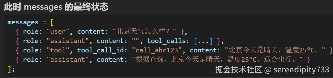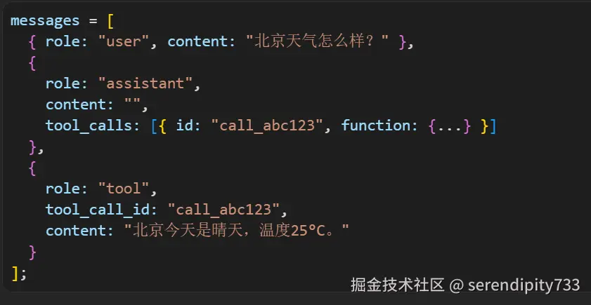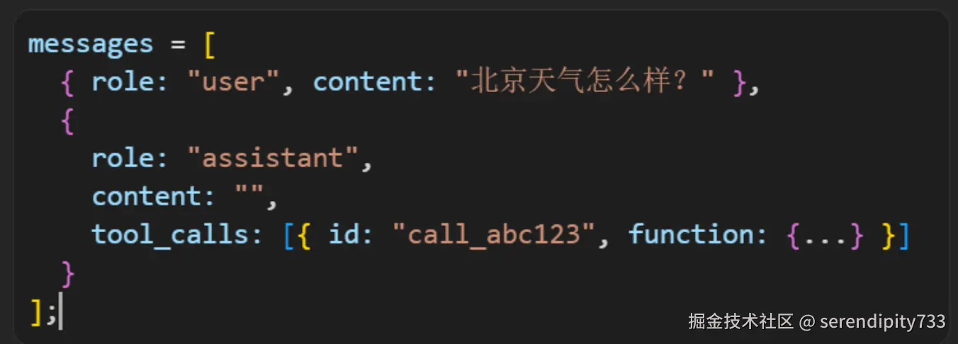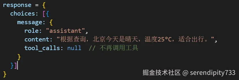 arguments: "{\"location\":\"北京\"}" // 完整的 JSON 字符串
