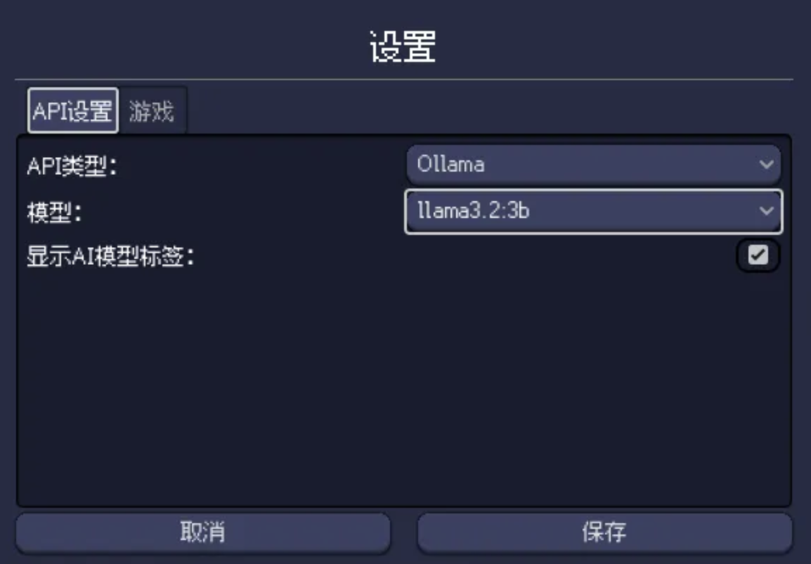 加载游戏后,按键盘上esc,弹出设置,选择我们本地部署的大语言模型(好像会自动配置。如果没有自动配置的话就选择一下)