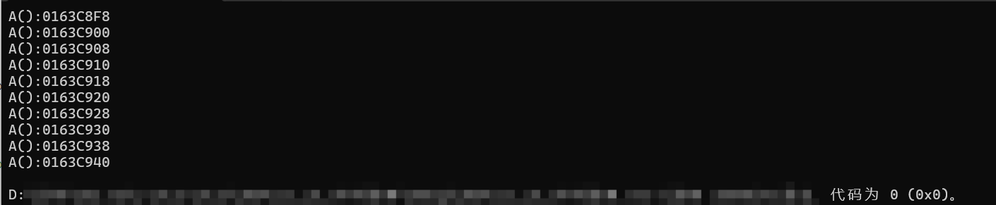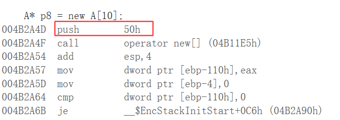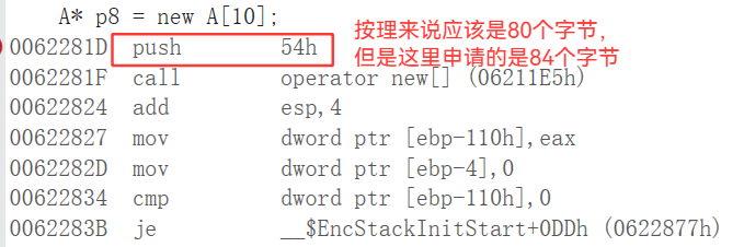 一个A对象8个字节,申请了10个A对象,应该是80个字节。