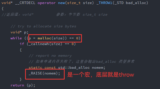不使用malloc而是使用operator new 的原因是new失败了抛异常,而malloc失败是返回空。