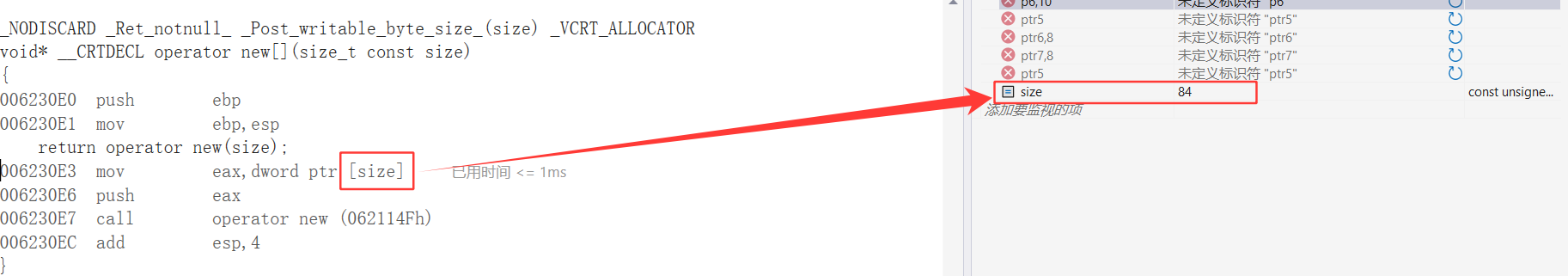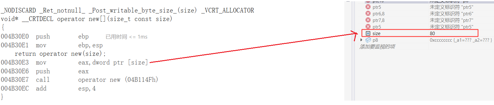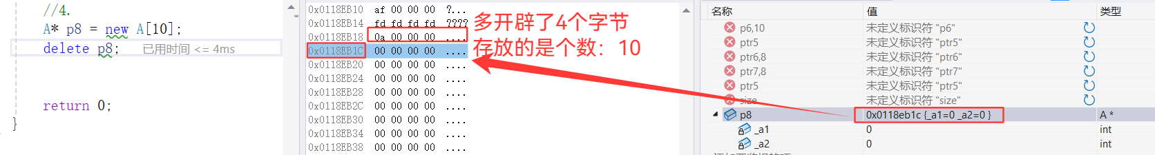 2.其次delete p8;释放的位置不对。 直接就在p8进行释放,因为没有记录个数也不会多开4个字节,但是释放内存是不能从中间释放的所以这个时候就报错了。(报错的实际原因是:释放的位置不对)