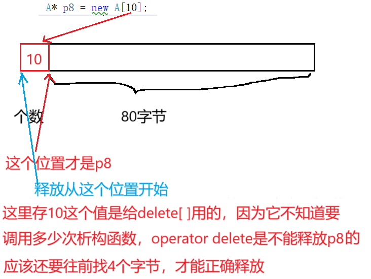 并不是只释放了1个A对象,A* p8 = new A[10]; -> 底层是由malloc开辟的,delete p8;->底层释放空间是free,malloc一块空间free掉是没有问题的,malloc和free底层也会记录这块指针指向的空间是多大。