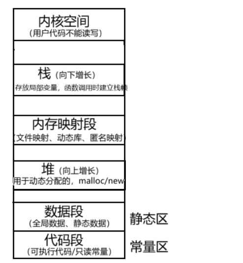 1.栈又叫堆栈------非静态局部变量/函数参数/返回值等等,栈是向下增长的。