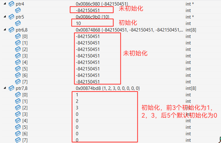 int* ptr7 = new int[8] {1, 2, 3}; //前3个初始化为1 2 3,后5个默认给0