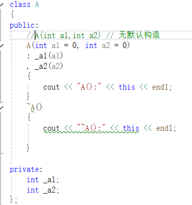 此时的 p1 只开了空间,没有初始化,没办法初始化因为成员变量是私有的,没办法显示的去初始化,调构造,但是构造都是定义对象的时候自动调用的,写一个 Init( ) 函数, Init( )函数跟A的构造函数的功能是重叠的,是可以的。还有其他方式:定位new。