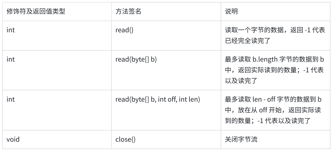 - int read(byte [ ] b,int off ,int len) :off 指定了每一次读取字节后存放到数组b的起始位置,len 指定了每一次预期读取的最大字节数