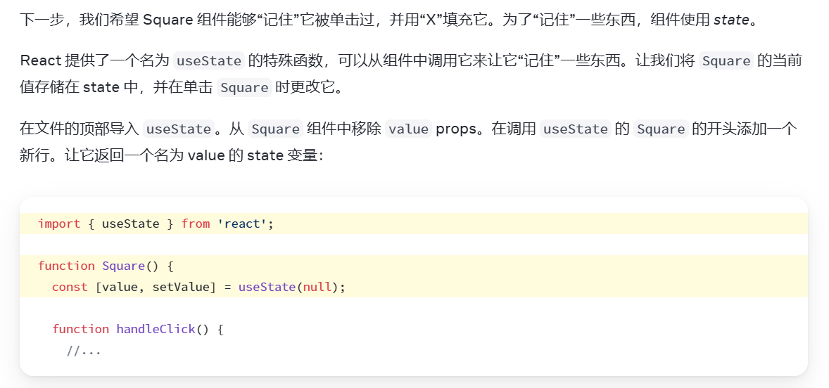 组件)也会跟着重新渲染,这样页面上的棋盘就会更新为新的状态,我们就能看到第一个格子被填充为X
