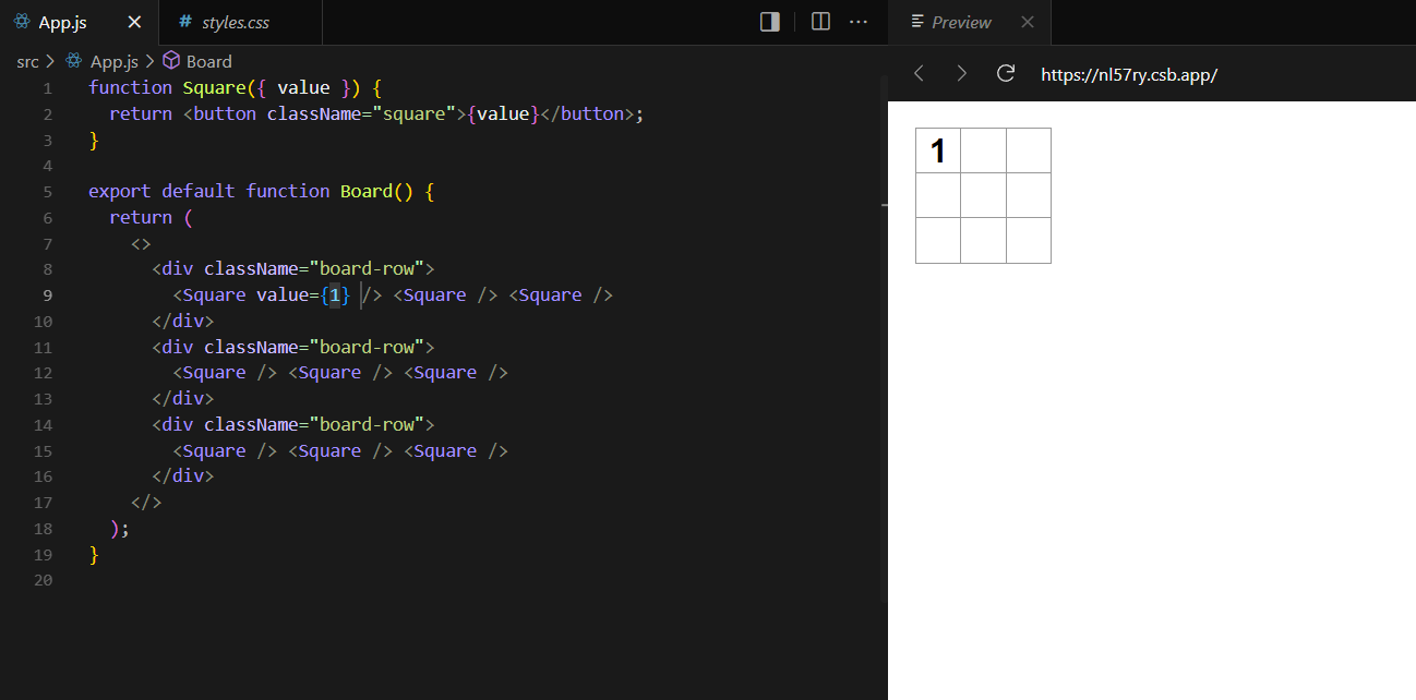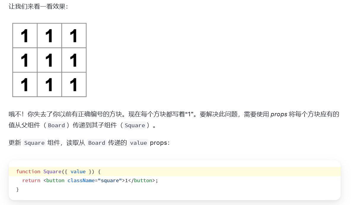函数组件:htmlfunction Square(){ return <button className = "square">1</button> }