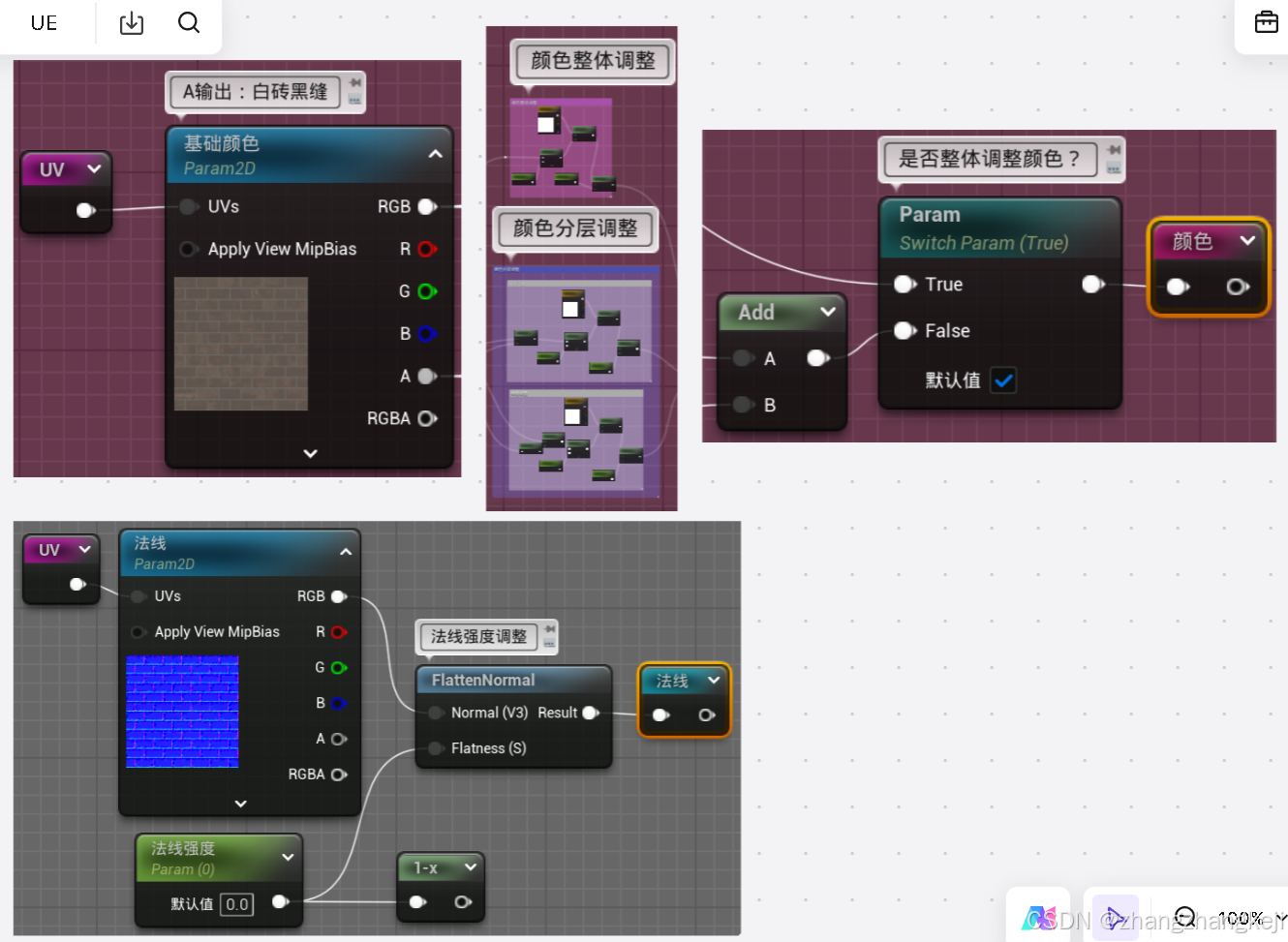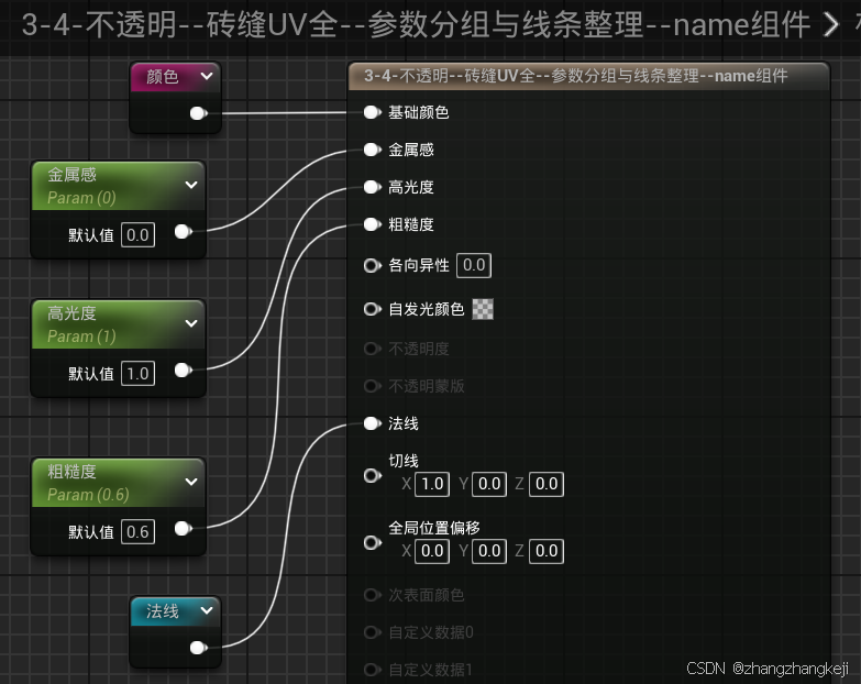 (38)当材质的编写逻辑太大 ,将无法放到一版屏幕上。所以需要整理一下。3-4-不透明--砖缝UV全--参数分组与线条整理--name组件