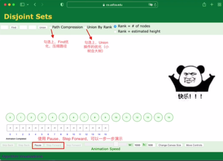 - 每次Find操作,先找根,再"压缩路径",可使树的高度不超过O(α(n))。α(n)是一个增长很缓慢的函数,对于常见的n值,通常α(n)≤4,因此优化后并查集的Find、Union操作时间开销都很低。