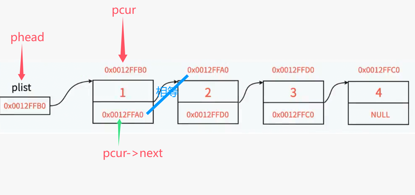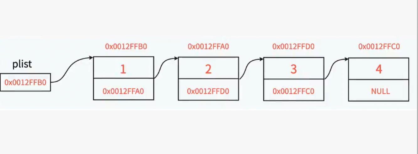 只要pcur不为NULL,while会一直循环,在while循环里打印pcur->next的值,再通过pcur = pcur->next(下一个节点的指针)使pcur移动到下一个节点,直到pcur移动到最后一个节点就退出循环,最后我们手动加上链表最后的空指针NULL。
