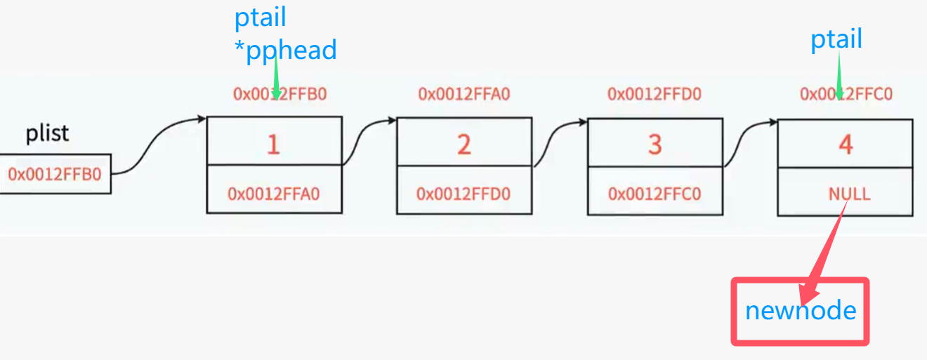 你通过tail(一级指针),让最后一个人伸手拉住新朋友(tail->next指向新节点)。