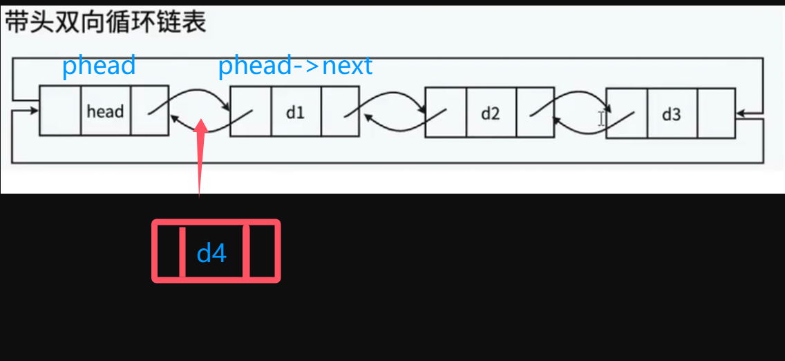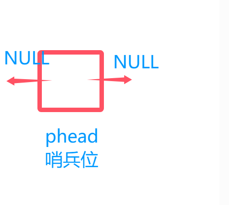 我们需要注意的是单链表在最开始通常是一个空链表(phead = NULL),但双向链表必须有一个哨兵位的存在,因此在插入数据前链表中必须初始化到只有一个头指针的情况。申请节点需要用到malloc函数,记得注意申请失败的情况,而且要定义节点的内容(我们还不知道申请的这个节点的下一个节点和上一个节点是什么,但不能指向NULL,因为一旦指向NULL链表的情况就如下,不符合我们对双链表的定义,所以为了让它保持循环状态,就需要让next和prev指向自己)后面申请的节点初始状态都是一个类似于自循环的状态。