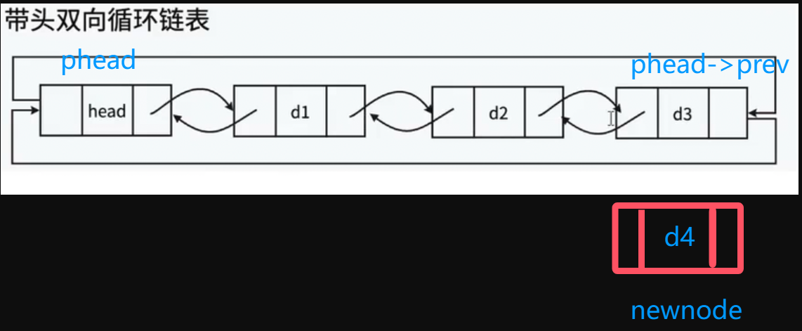 尾插的过程就是先让新指针连上哨兵位(phead)和原链表的最后一个节点(phead->prev),再让原链表的最后一个节点(phead->prev)指向新节点,最后让哨兵位(phead)指向新节点。