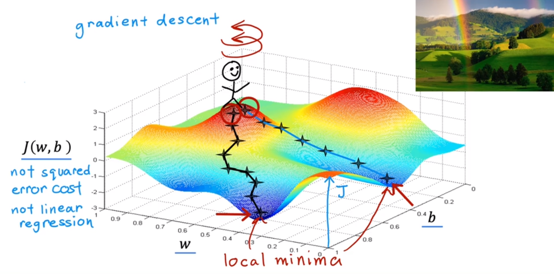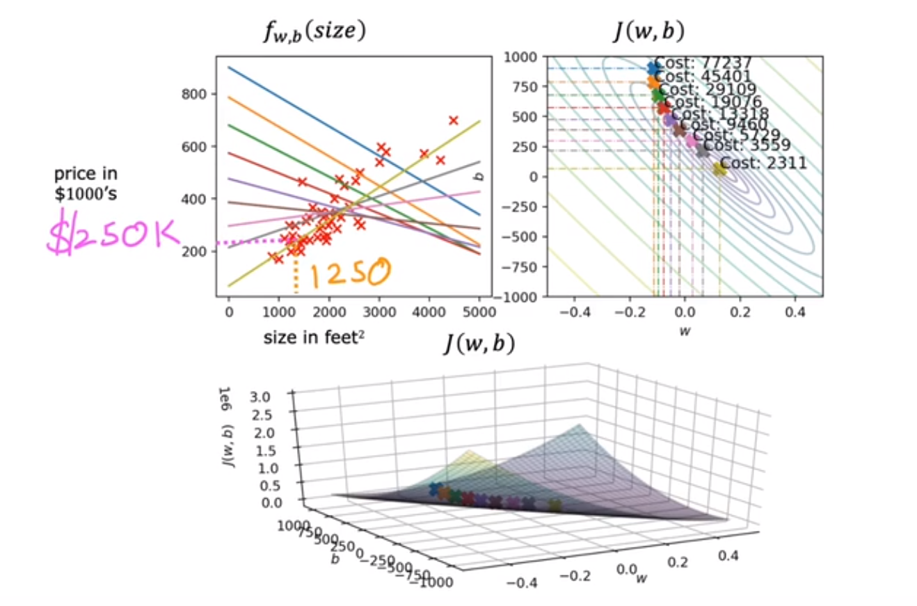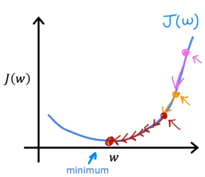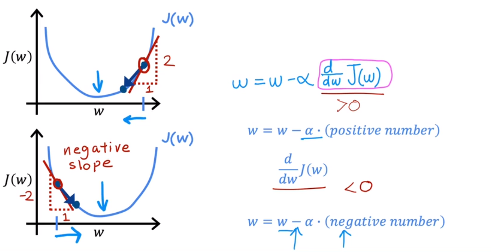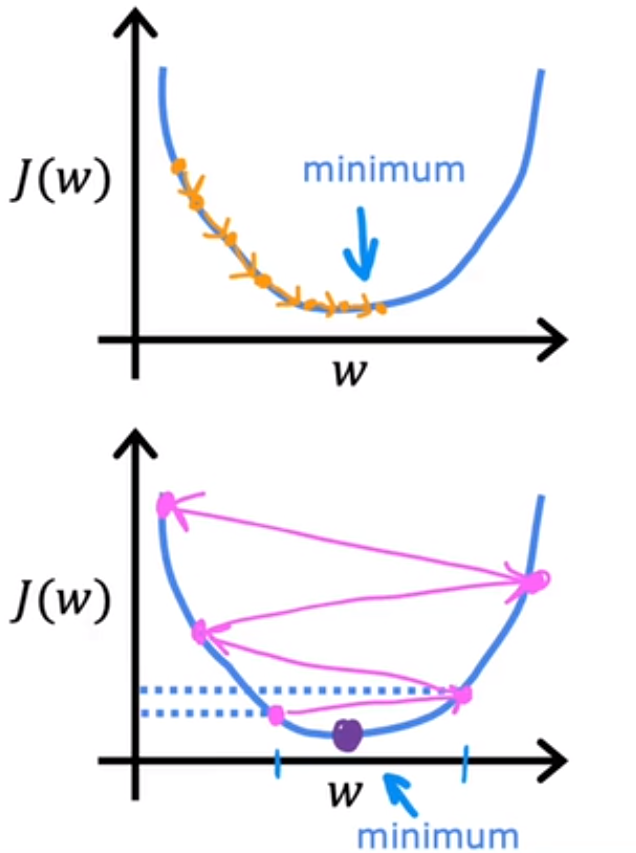 时,w不断减小,直到J达到最低点;下图同理,起始点右侧,当不断迭代学习率